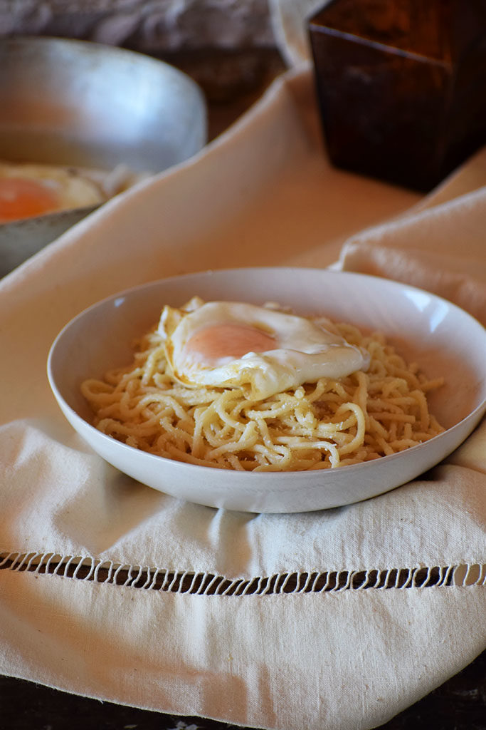 6Σερβίρουμε τα μακαρόνια και προσθέτουμε το αυγό από πάνω.