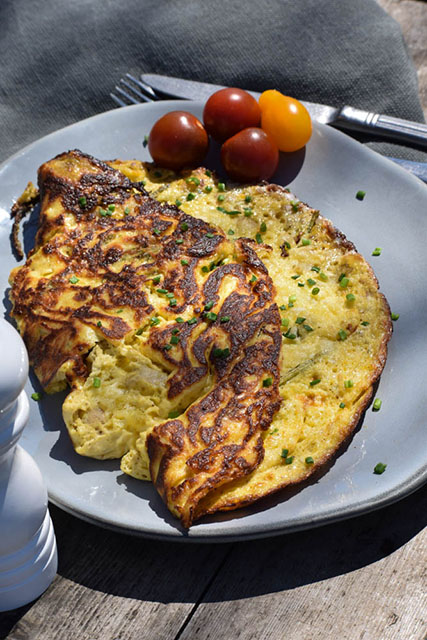 6Αφήνουμε την ομελέτα να γίνει απο τη μία πλευρά και χωρίς να την γυρίσουμε τη βάζουμε στο φούρνο για 10 λεπτά περίπου.Όταν ψηθεί βγάζουμε το τηγάνι από το φούρνο και σερβίρουμε με ψιλοκομμένο σχοινόπρασο.